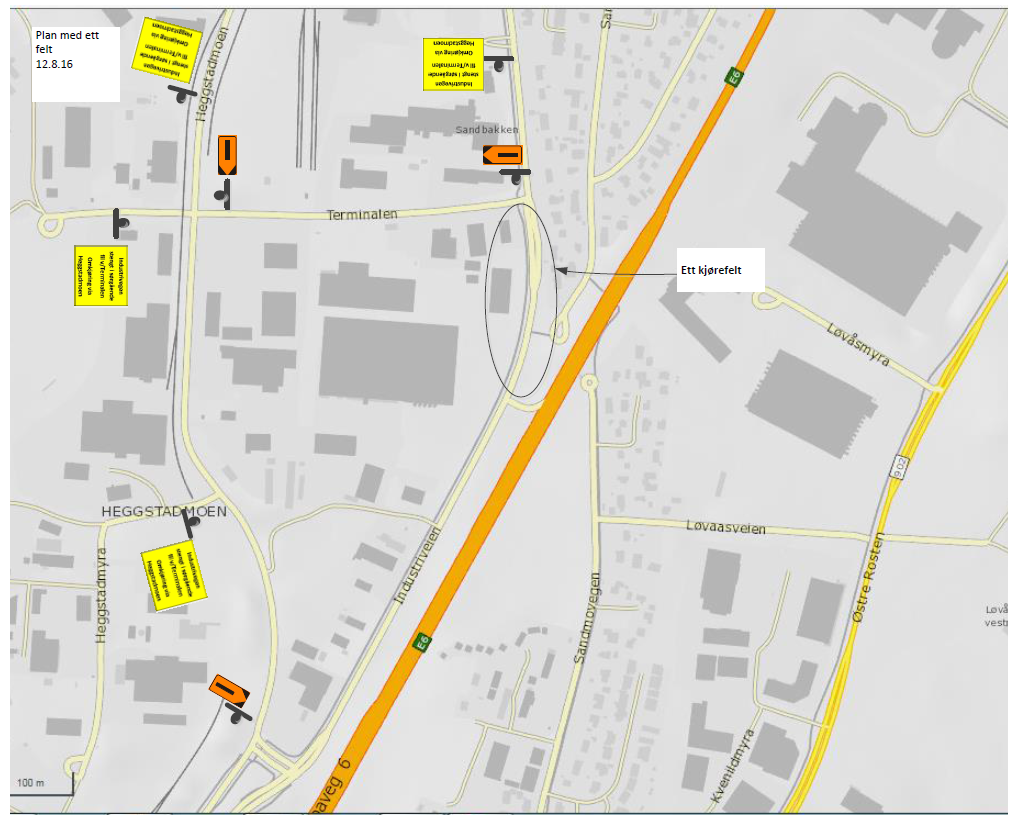 Det blir skiltet omkjøring via Terminalen og Heggstadmoen, se kart.